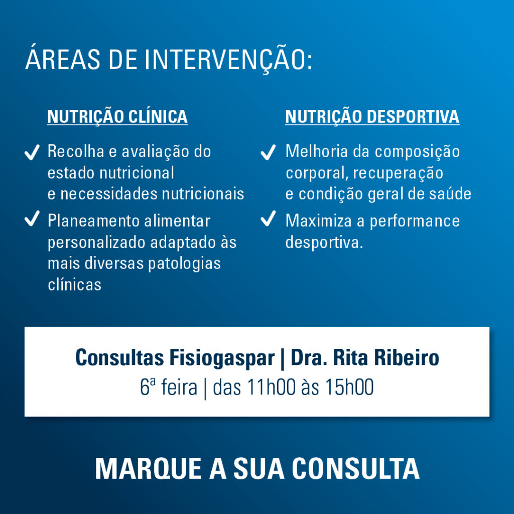 A nutricionista Rita Ribeiro está disponível para desenhar o seu plano alimentar de forma personalizada e adaptado às mais diversas patologias clínicas. Se pratica uma modalidade desportiva, uma intervenção nutricional adequada pode fazer a diferença e maximizar a sua performance desportiva.