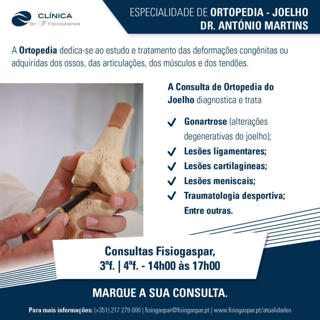 O Dr. António Martins Ortopedista interno da Fisiogaspar, especialista na Cirurgia Artroscópica e Reconstrutiva do Joelho, desenvolve uma colaboração estreita e multidisciplinar com os fisiatras e os fisioterapeutas no tratamento das mais diferentes patologias que afetam a função do aparelho locomotor.