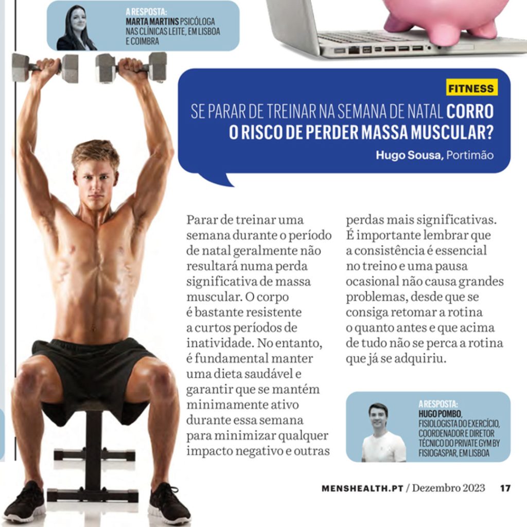O fisiologia do exercício Hugo Pombo, esclarece a questão sobre se parar de treinar na semana de natal corre o risco de perder massa muscular, à revista Men’s Health.